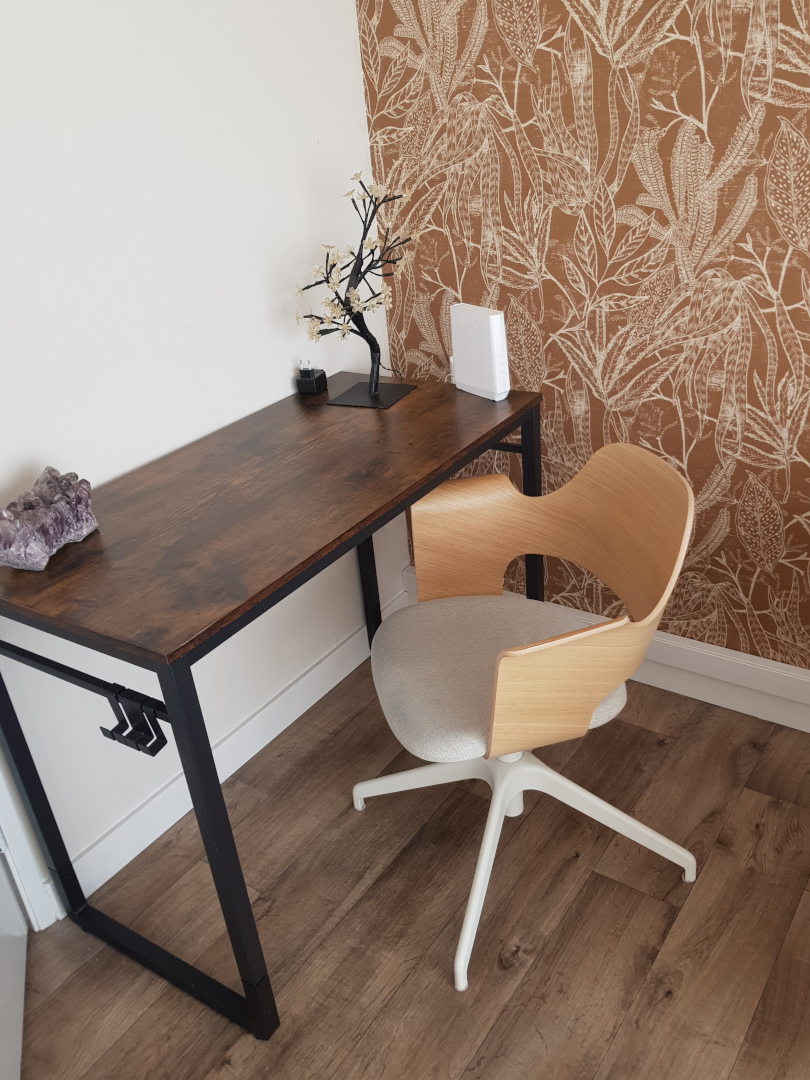 Work & Dine: The living area includes a dedicated desk and comfortable office chair, alongside a high dining table with two stools.