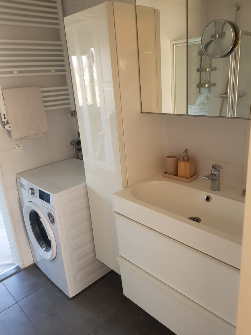 In-Unit Laundry: A washing machine is available right in the bathroom for ultimate convenience during longer stays.